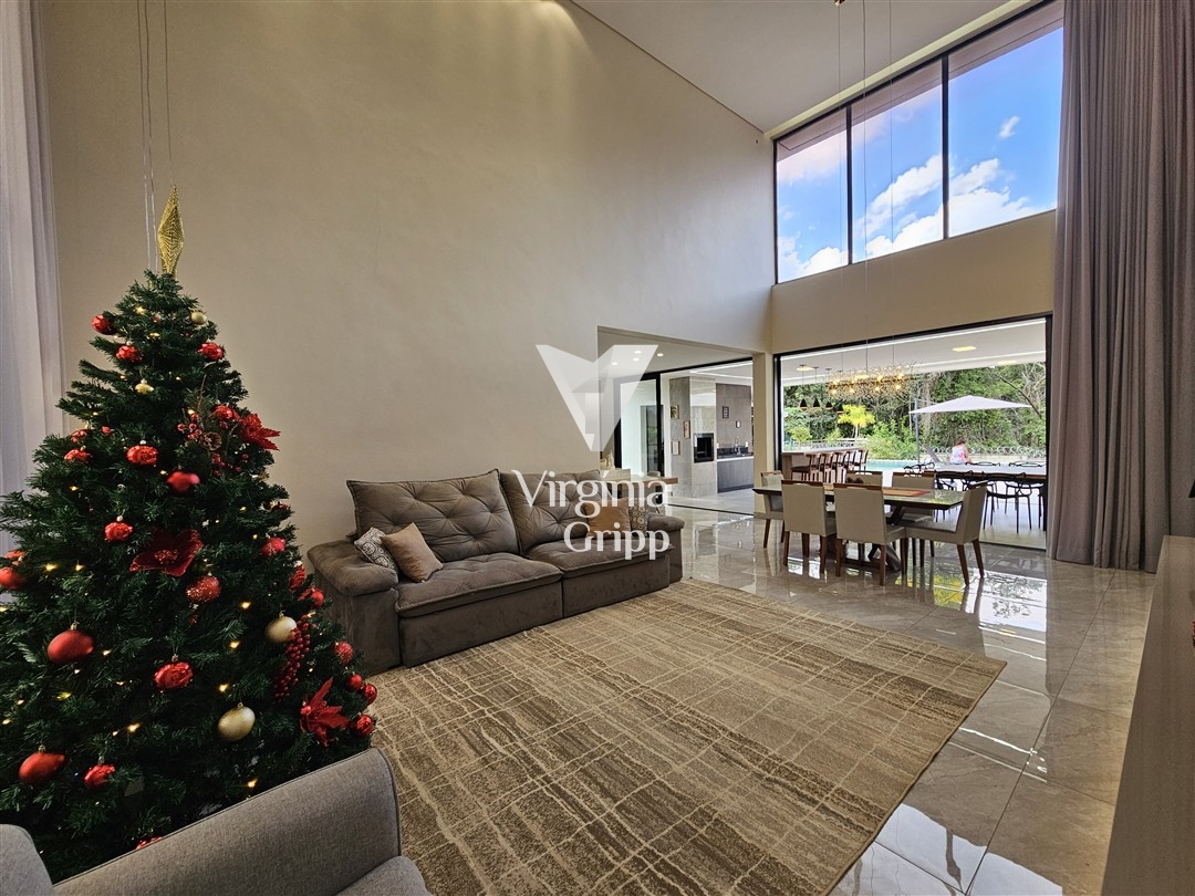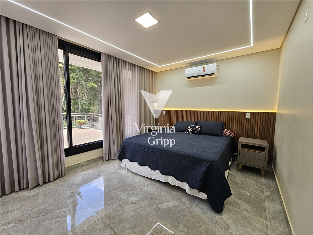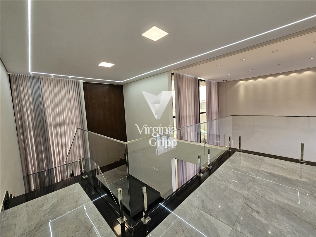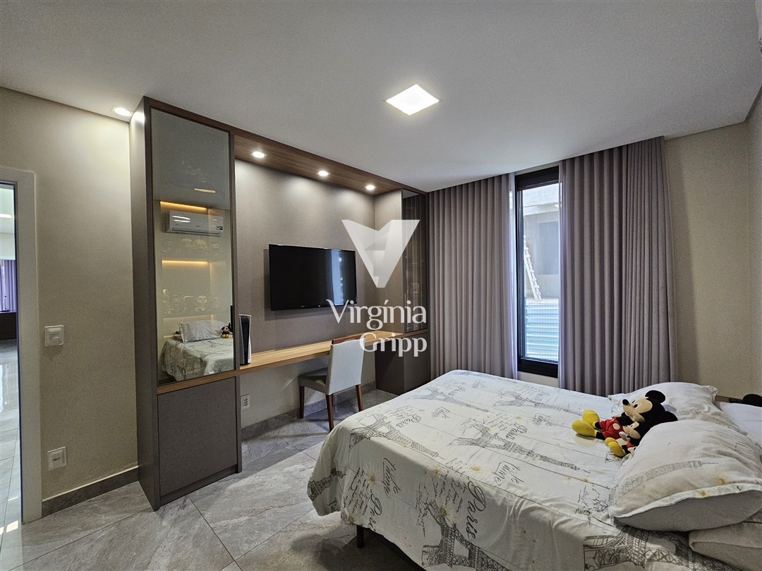 - Sala de TV climatizada com pé direito duplo, painel iluminado e ripado, integrada com a sala de jantar. Possui predisposição para cortinas eletrônicas